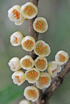花期は3〜4月、枝の下側に短くぶら下がるように多数咲く。花は白っぽいクリーム色で壺状で、強い芳香を放つ。この芳香は一般的な花の匂いとは大きく異なり、都市ガスやたくあんに似た独特の匂いである。