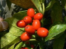 フイリアオキ (ミズキ科 アオキ属) 常緑低木 学名:Aucuba japonica [jt20] 艶のある大きな葉に、様々な斑の入ったアオキはガーデニング用の低木として人気が高い。 雌雄異株であるが、雌株の場合は冬に赤く色づく実も楽しめる。 星斑の品種が普及しているが、外斑や葉型の異なるものなど多くの品種がある。 ※WEBで公開されている情報を集め、携帯用に加工しております。