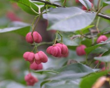 秋の果実の色は品種により白、薄紅、濃紅と異なるが、どれも熟すと果皮が四つに割れ、鮮烈な赤い種子が四つ現われる。