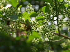 薄い緑で、四弁の小花。果実は枝にぶら下がるようにしてつき、小さく角ばった四裂の姿。